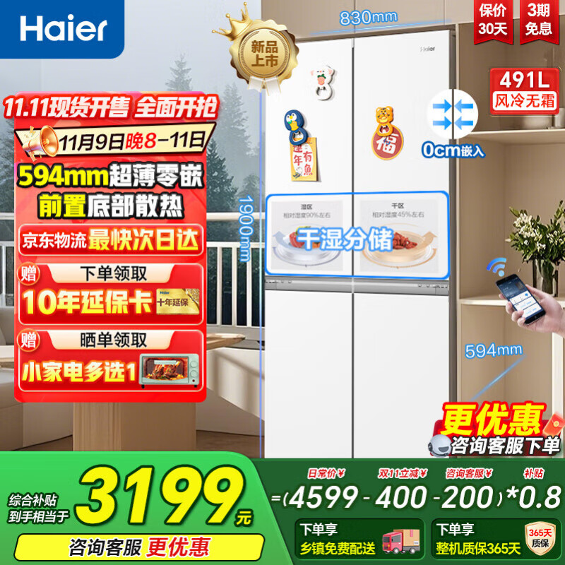 包邮 海尔【国家补贴20%】海尔冰箱491L大容量家用电器零嵌法式十字电冰箱风冷无霜超薄594cmm零嵌一级能效 491升超薄零嵌入式冰箱