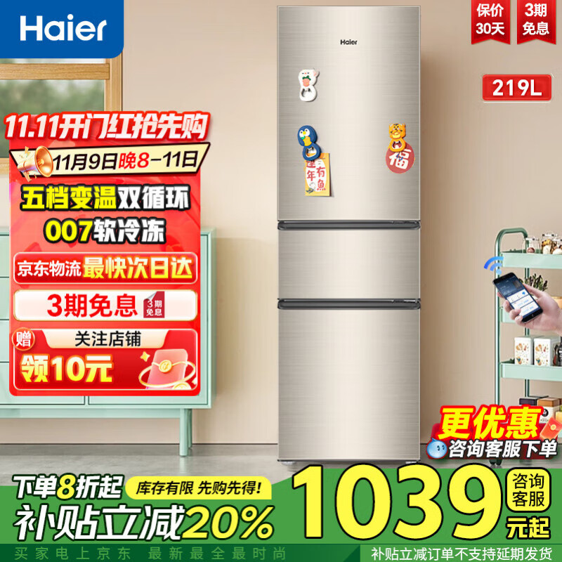 包邮 海尔冰箱219升三开门冰箱小型家用电器宿舍租房小冰箱多温区保鲜冷冻节能低噪超薄国家补贴以旧换新 219升三门直冷节能丨007软冷冻